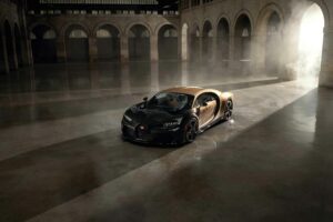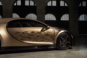 As if purchasing a Bugatti wasn’t special enough, a very well-heeled client has commissioned this exceptional custom creation to enhance their Chiron even further. Following two years of design and bespoke craftsmanship working closely with Bugatti’s ‘Sur Mesure’ customisation team, the Golden Era Chiron was the result. Taking a Chiron Super Sport as a starting point, the most obvious feature are the 45 hand sketches to the paintwork, 26 on the passenger side showing the early days of the brand and 19 on the driver’s side following the brand’s rebirth from 1987 to today. The sketches were hand drawn directly to the car in pencil and took over 400 hours by the skilled designers.